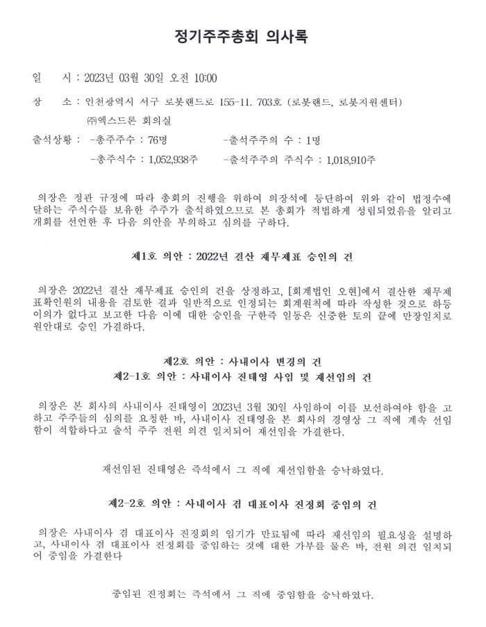 ÁÖ½Äȸ»ç ¿¢½ºµå·Ð Á¦9±â Á¤±âÁÖÁÖÃÑȸ ÀÇ»ç·Ï